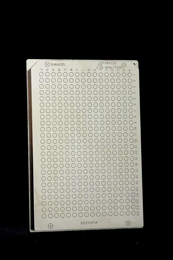 A MALDI sample plate containing 96 wells that is 10 millimeters thick. The internal diameter for each individual well on this target is 4.7 millimeters, well suited for polymer applications. This target can be used with AXIMA MALDI-TOF instruments which have the AXIMA 10mm Sample Plate Adapter Kit (TO-722R00) (source modification) and with all MALDI-7090 instruments.
